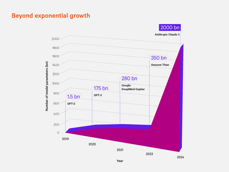 Figure 1. The projected growth for AI development is only expected to be bigger. Large language models’ (LLMs) development growth in recent years implies a crucial and indicative growth and increase in the critical digital infrastructure required. But functions for AI demands differ, thereby prompting continuous learning as it grows: as an example, the power, cooling, and resilience needed for training the models are different from those needed for inference. Source: Omdia