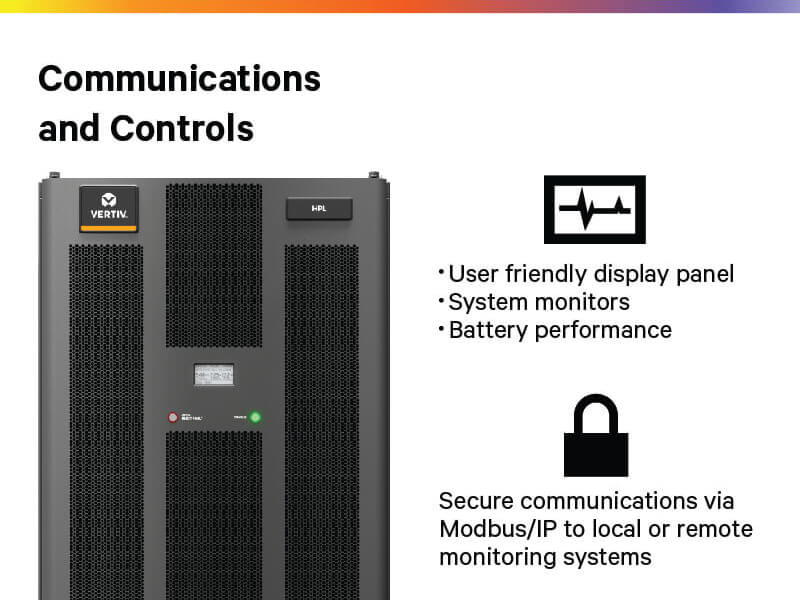 Configured in a standard 24’’ IT rack that ships with six 78Ah lithium-ion battery modules installed, the Vertiv HPL provides up to 44kWh capacity with 240kW power density. The HPL battery modules operates up to 86 degrees Fahrenheit (30°C) continuously, allowing data centers to reduce cooling cost and improve PUE. Vertiv HPL offers features specifically designed for data center application such as a redundant BMS (Battery Management System) architecture, internal power supply and user-friendly HMI display, which improves system reliability and achieves best-in-class user experience. Vertiv HPL is seamlessly integrated with Vertiv’s UPS and monitoring products to provide a higher level of protection, transparency and performance improvement. The HPL battery modules have a 10-year warranty on runtime with lifetime operating data stored in the BMS, which assures you with lifetime confidence for your decision.