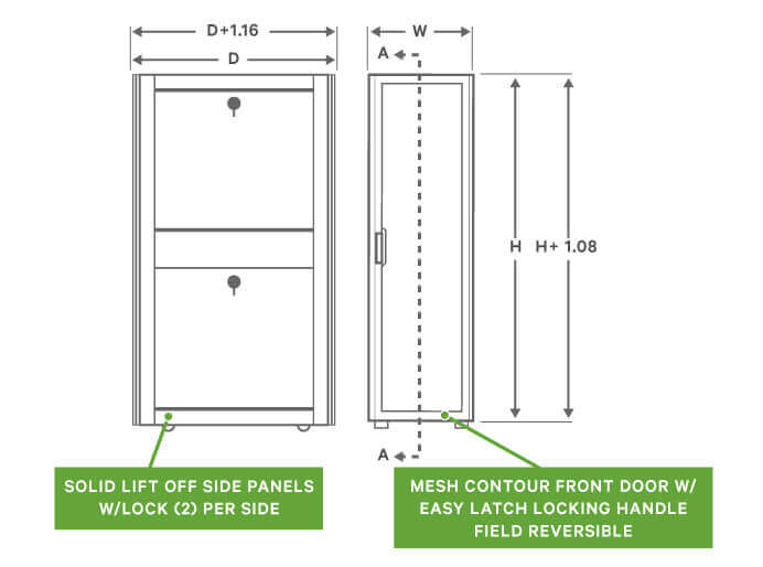 - The DCE is available in 24U, 42U, 45U, and 48U heights. Widths of 600mm, 700mm, or 800mm and Depths of 1100mm and 1200mm. Each rack includes: single perforated front door, Split perforated rear doors, Locking handles front and rear, 2 pairs split side panels, Cable entry top cover, 2 sets of 19" EIA Rails, 2 Full height rack PDU Mounting / Cable management brackets, casters and leveling feet, Baying brackets, along with Installation Hardware package.
